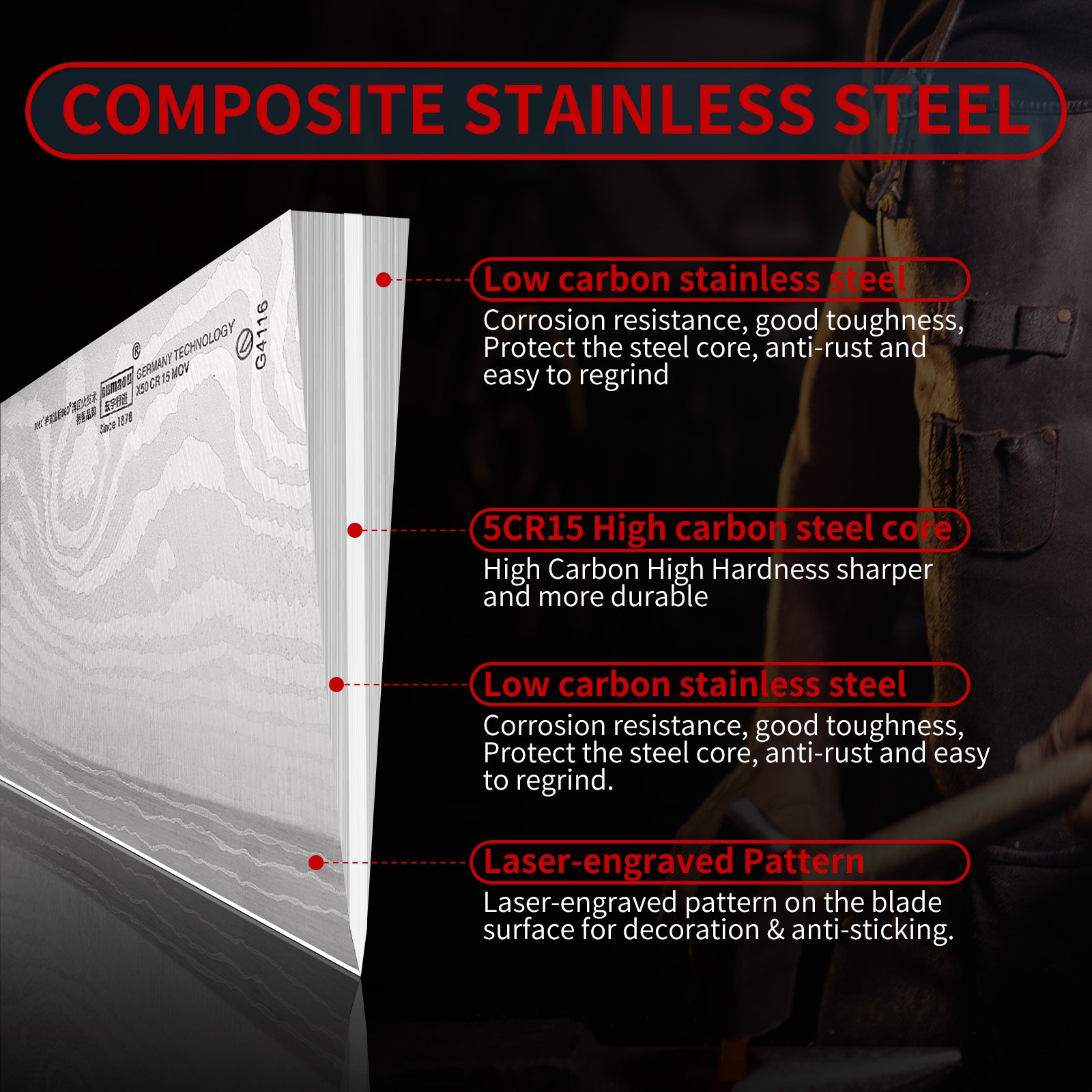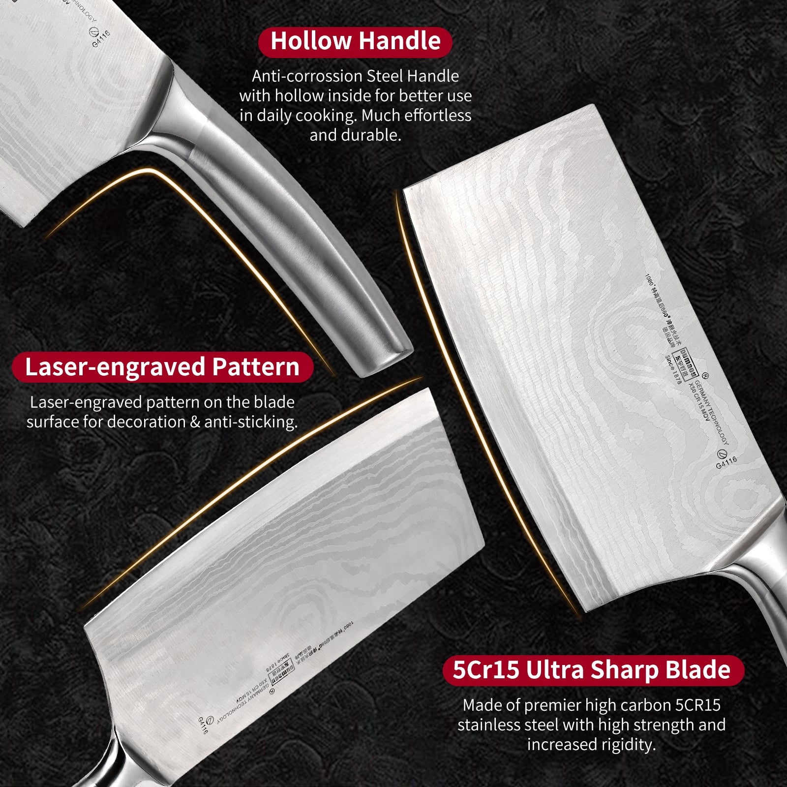 - 【Precise Craftsmanship】 Each knife is hand polish producing a sleek blade and smooth grip with super sharp cut. Unique treatment creates long lasting sharpness.Laser-engraved pattern on the blade surface for decoration & anti-sticking.