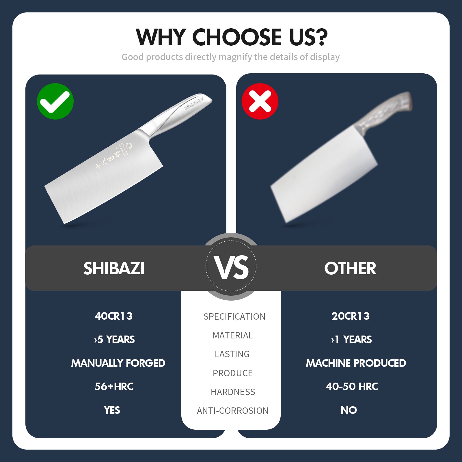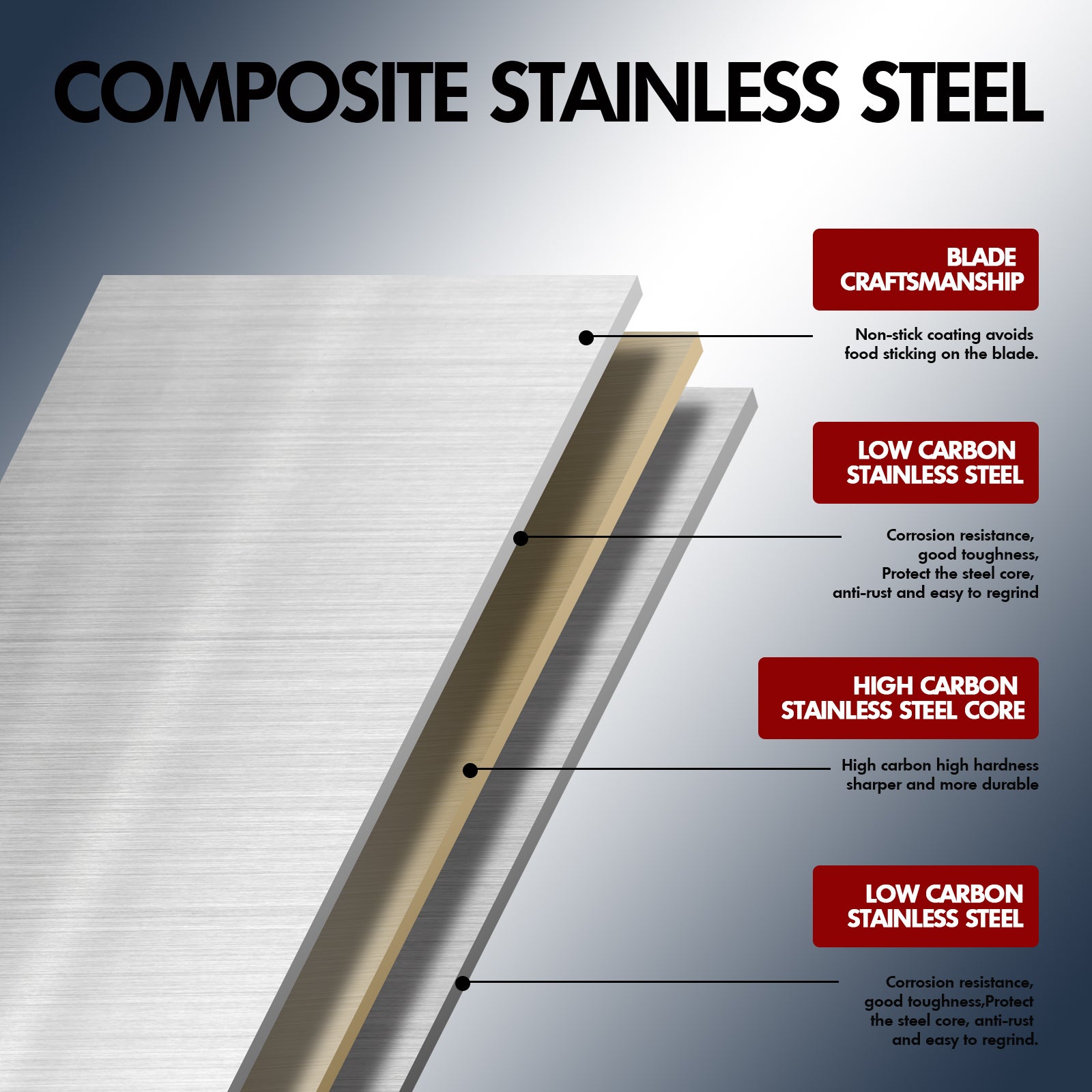 - Premium Stainless steel - 3-layer high quality clad stainless steel. 40Cr13 high carbon core steel performs excellent hardness, durability and sharpness maintaining. Outside layers of low carbon steel does well in toughness, corrosion resistance and plasticity. The combination of two steels makes the knife perfectly work.